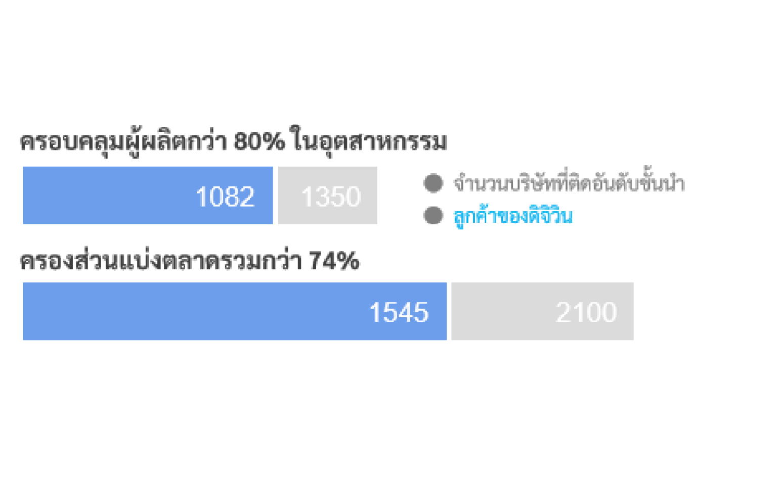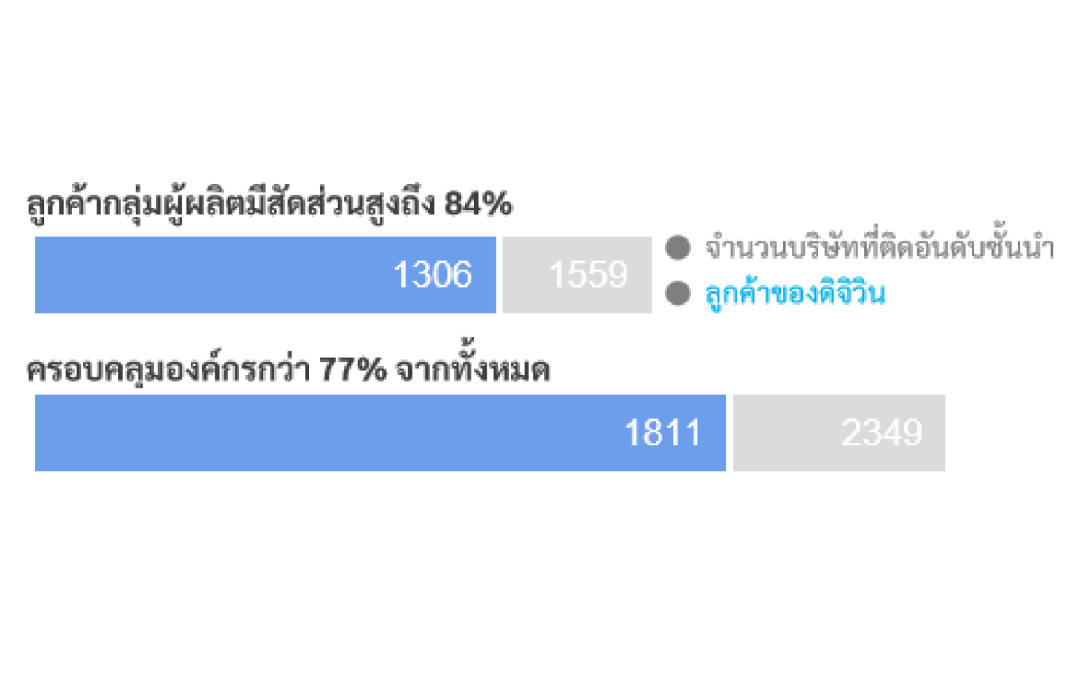 จากบริษัทที่ออกหุ้นทั้งหมด 2,349 รายในปี 2023 ลูกค้าของ ดิจิวิน ครองสัดส่วนถึง 77% โดยเฉพาะในกลุ่มอุตสาหกรรมการผลิตที่มีสัดส่วนสูงถึง 84%