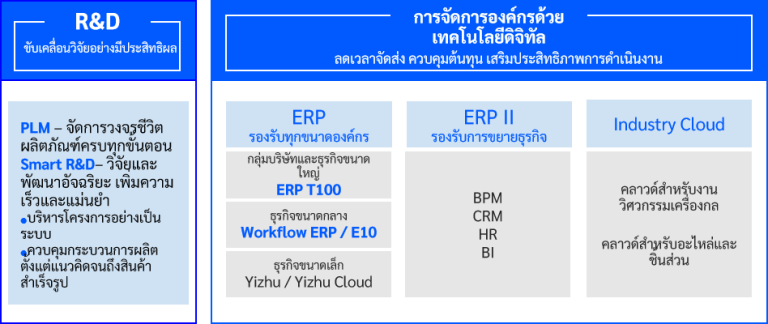 ดิจิวินพัฒนาโซลูชัน Digiwin ERP (Workflow ERP, T100 ERP/E10 เป็นต้น) และระบบจัดการการผลิต (MES, WMS, AIoT เป็นต้น) เพื่อรองรับความต้องการของทั้งองค์กรขนาดใหญ่ กลุ่มบริษัทข้ามชาติ และ SMEs ด้วยโซลูชันที่ปรับแต่งได้ตามรูปแบบธุรกิจ เราช่วยองค์กรสร้างระบบนิเวศที่ยืดหยุ่น ครอบคลุม และเชื่อมต่อได้แบบไร้รอยต่อ เพื่อพัฒนาประสิทธิภาพในการจัดการข้อมูลอย่างเหนือชั้น ในฐานะดิจิวิน กลุ่มธุรกิจระดับโลก เรามีจุดแข็งเรื่องการรองรับหลายภาษา (จีน / อังกฤษ / ไทย / เวียดนาม ฯลฯ) ความยืดหยุ่นสูง (ERP ระบบผสาน AI) และการรองรับข้อกำหนดท้องถิ่น (เช่น มาตรฐาน DBD, BOI, ใบรับรองดิจิทัล) เราพร้อมนำองค์กรด้านการผลิตเดินหน้าสู่ Smart Factory, ตัดสินใจอย่างชาญฉลาด และเปลี่ยนผ่านสู่ยุคดิจิทัล ดิจิวินคือคู่ค้าที่ยุคใหม่วางใจได้ ด้วยระบบบริหารองค์กรที่ตอบโจทย์ทุกมิติของการเติบโต