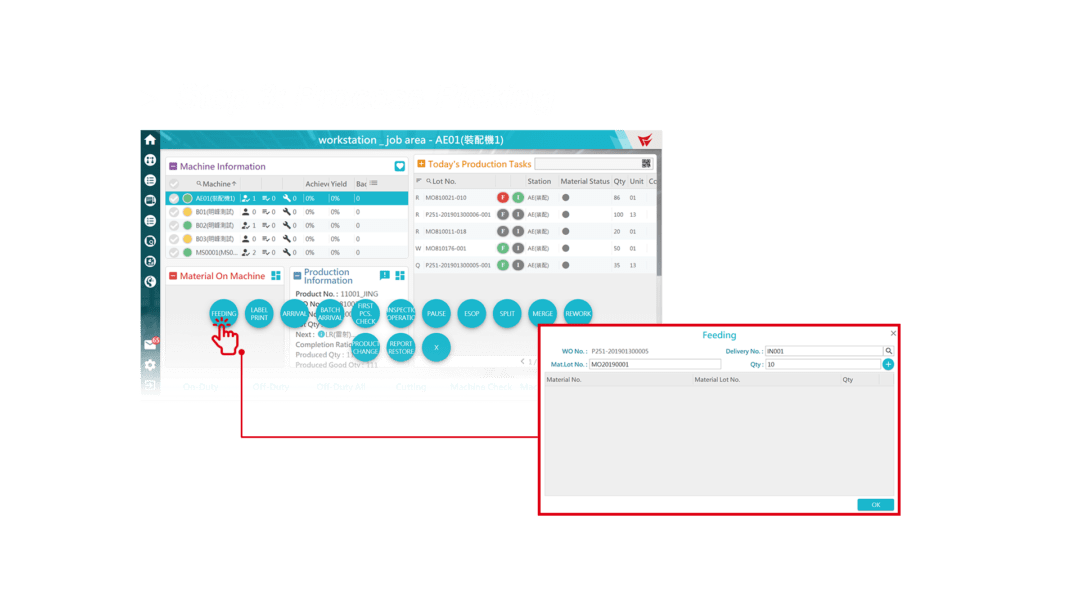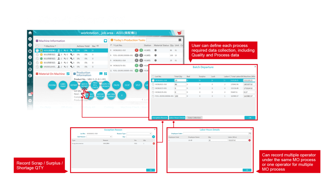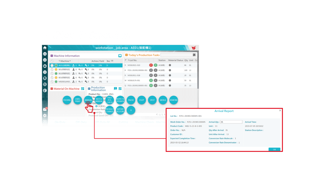 รวบรวมความคืบหน้าของใบสั่ง สถานะการผลิตของใบสั่งงาน ข้อมูลจำนวนของที่ไม่เพียงพอ สถานะของเครื่องจักร ฯลฯ เพื่อลดช่วงเวลาที่ต้องหยุดทำงานและจัดสรรทรัพยากรการผลิตอย่างมีประสิทธิภาพ